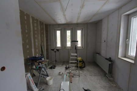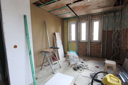 Dit voorjaar zijn we er eindelijk mee aan de slag gegaan. Alles moest gebeuren. Een nieuwe vloer voor de badkamers, de muren, elektra, afvoer, waterleiding, verwarming, plafond, enzovoort, enzovoort.