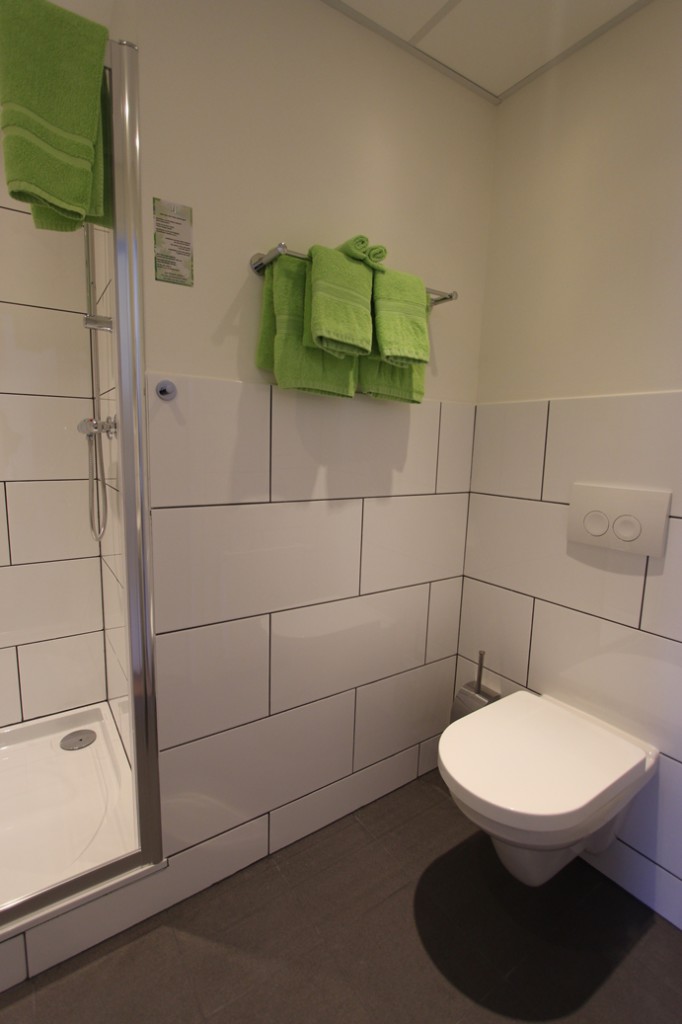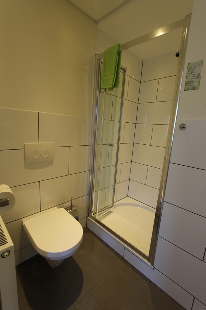 Alles zat er nog in. Een douche, een badkuip en een dames en een heren toilet. Deze kamer noemen we voor het gemak kamer 1.